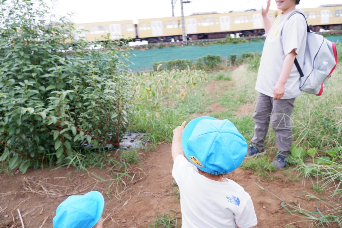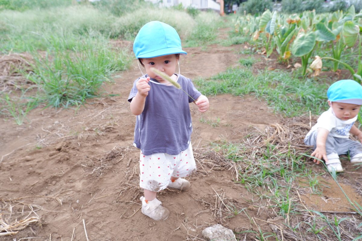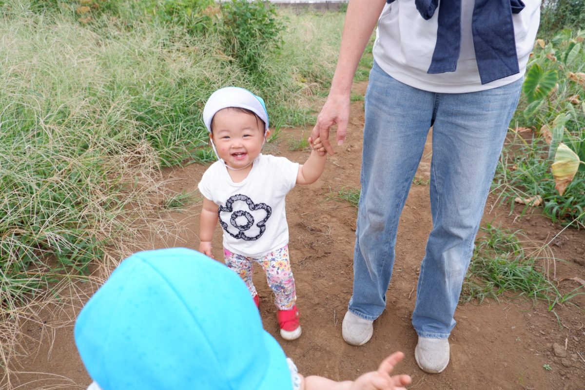 畑道では保育士と手を繋いで歩いたり、手を離して自分のペースで歩いています。