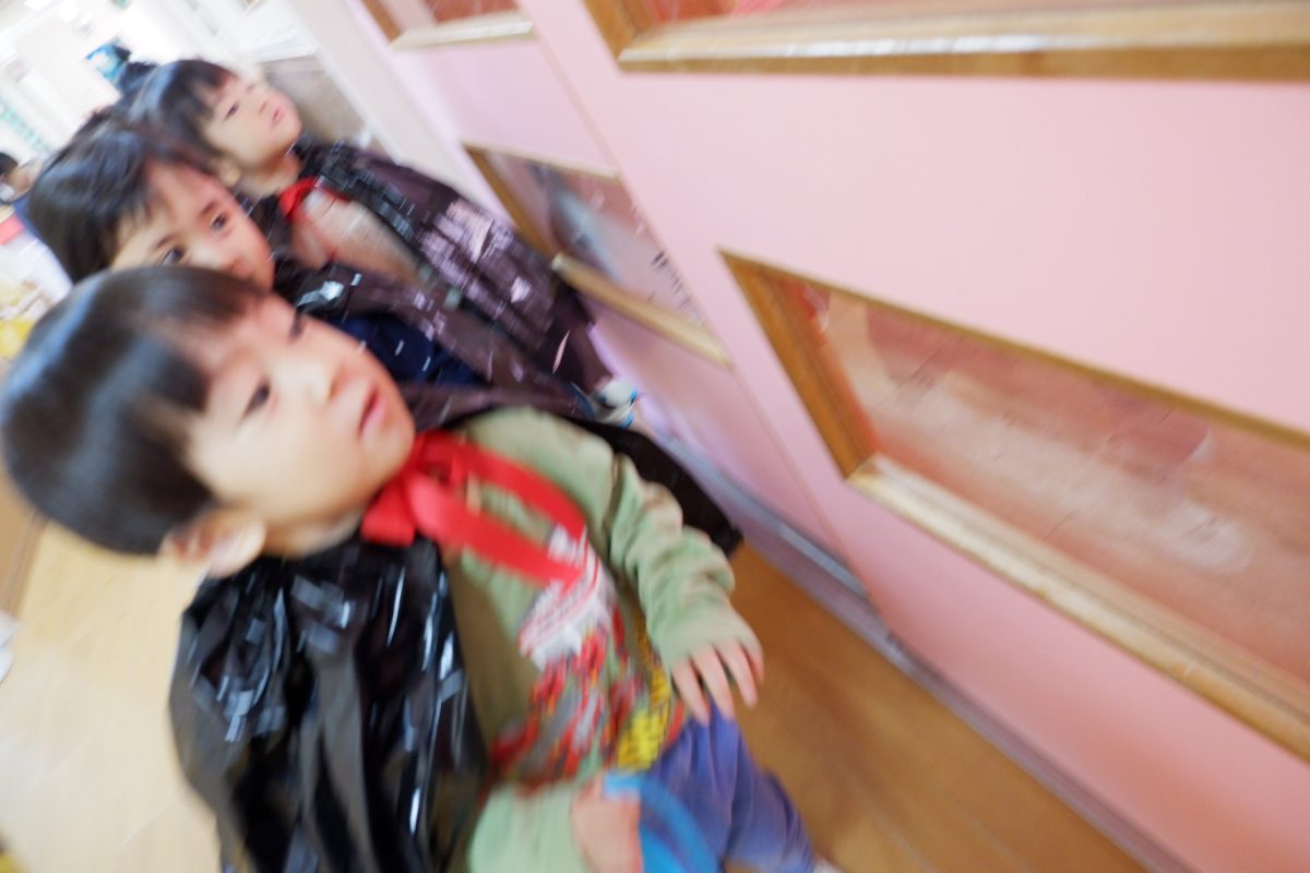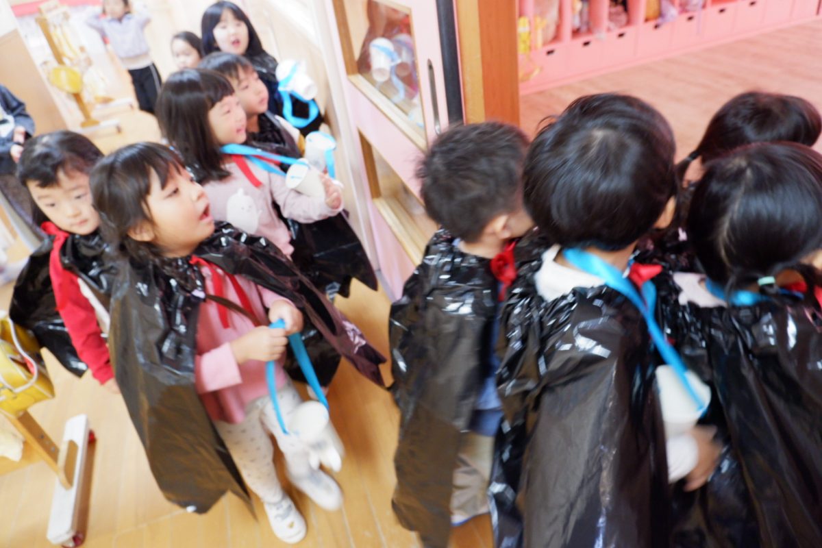 いつもと違うお化け屋敷のような雰囲気にはしゃぎながら入室します。