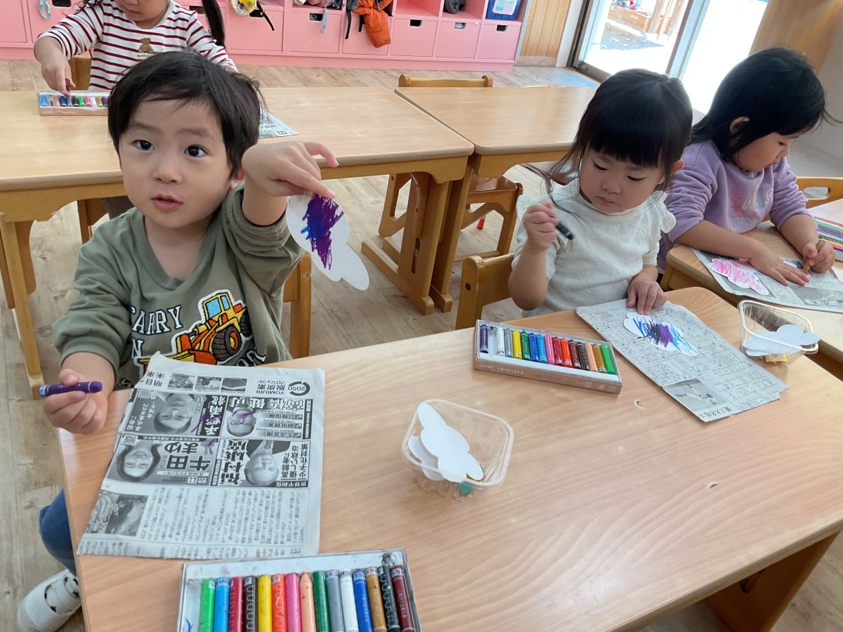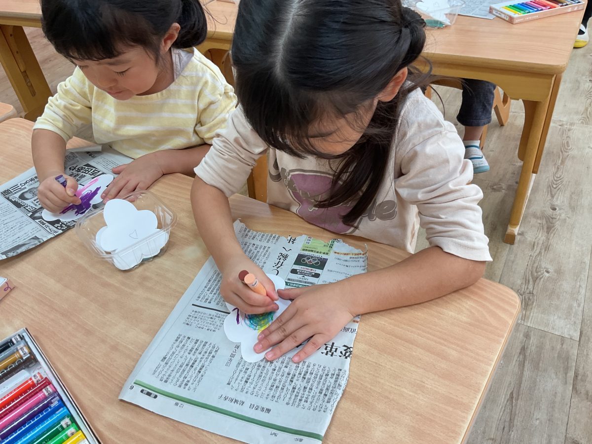 花型の真っ白な画用紙に好きな色を塗りその後はティッシュでこすって感覚を楽しんだり見た目の変化を楽しみました!