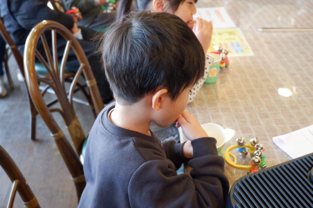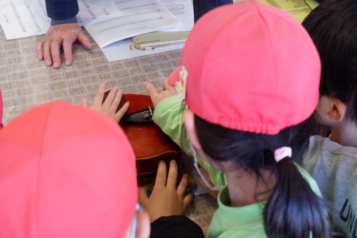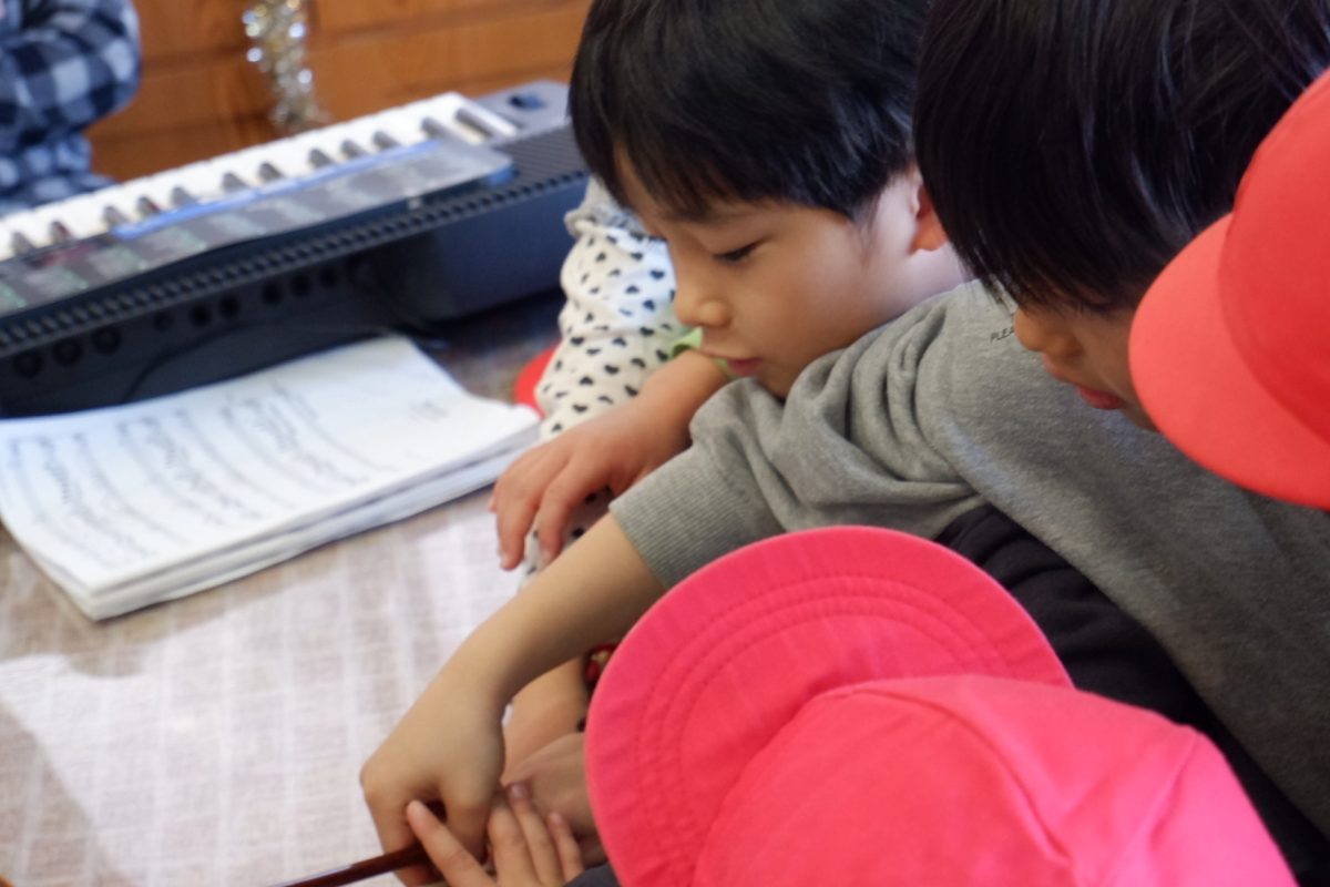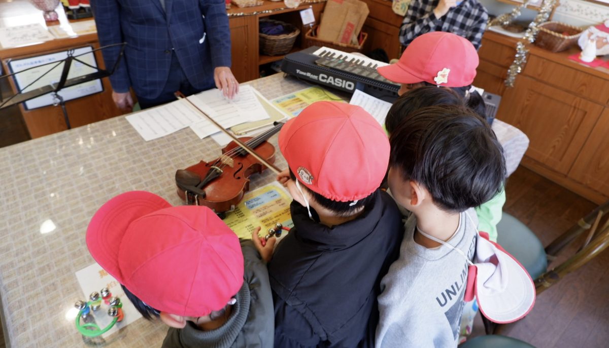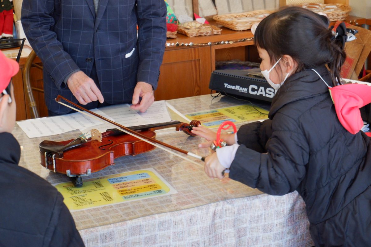 あわてんぼうのサンタクロースや赤鼻のトナカイ、きよしこの夜などクリスマスソングをピアノ、ヴァイオリン、そして子どもたちが奏でる鈴の音で楽しみました。