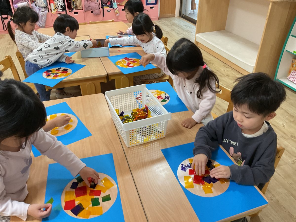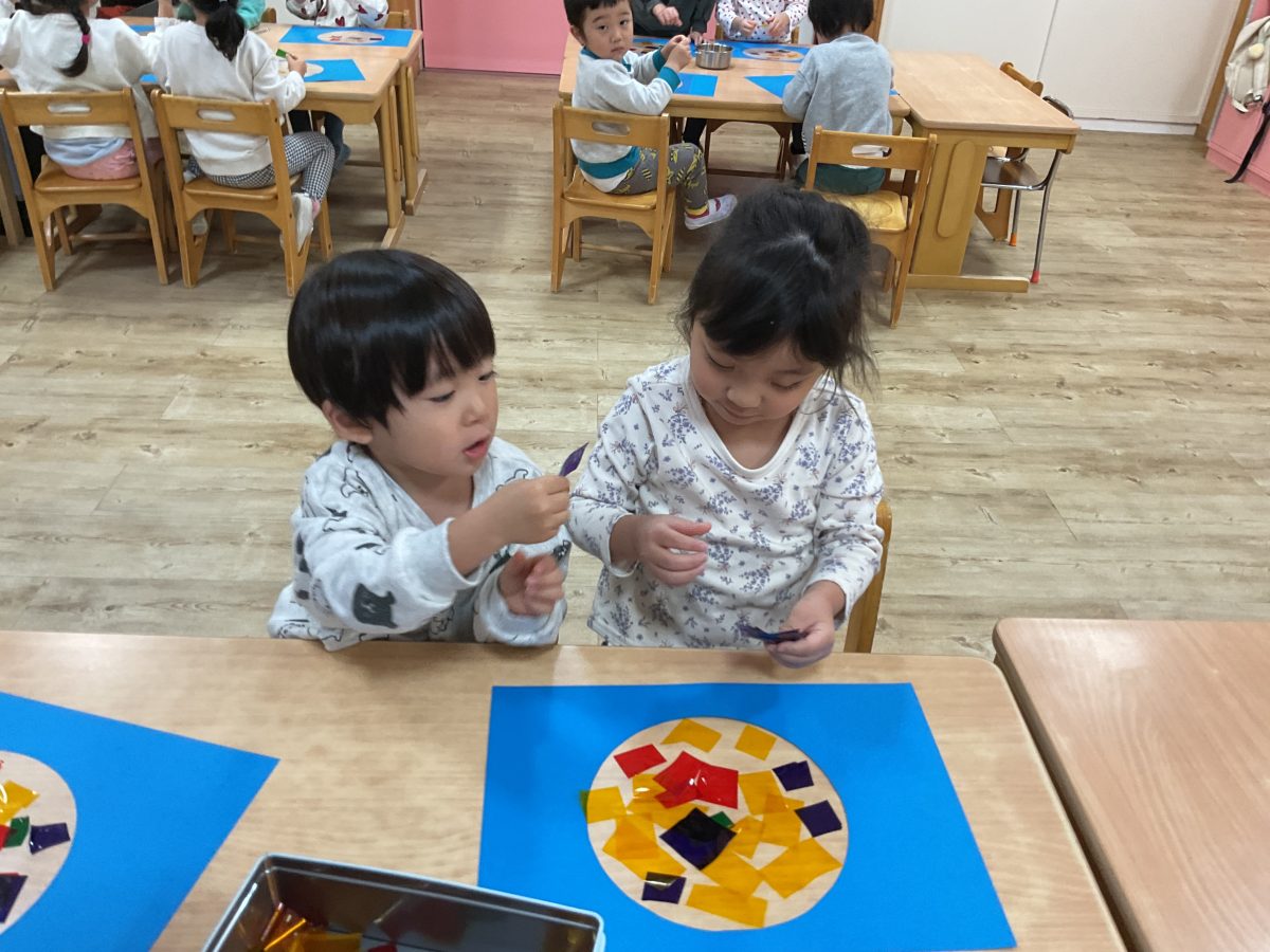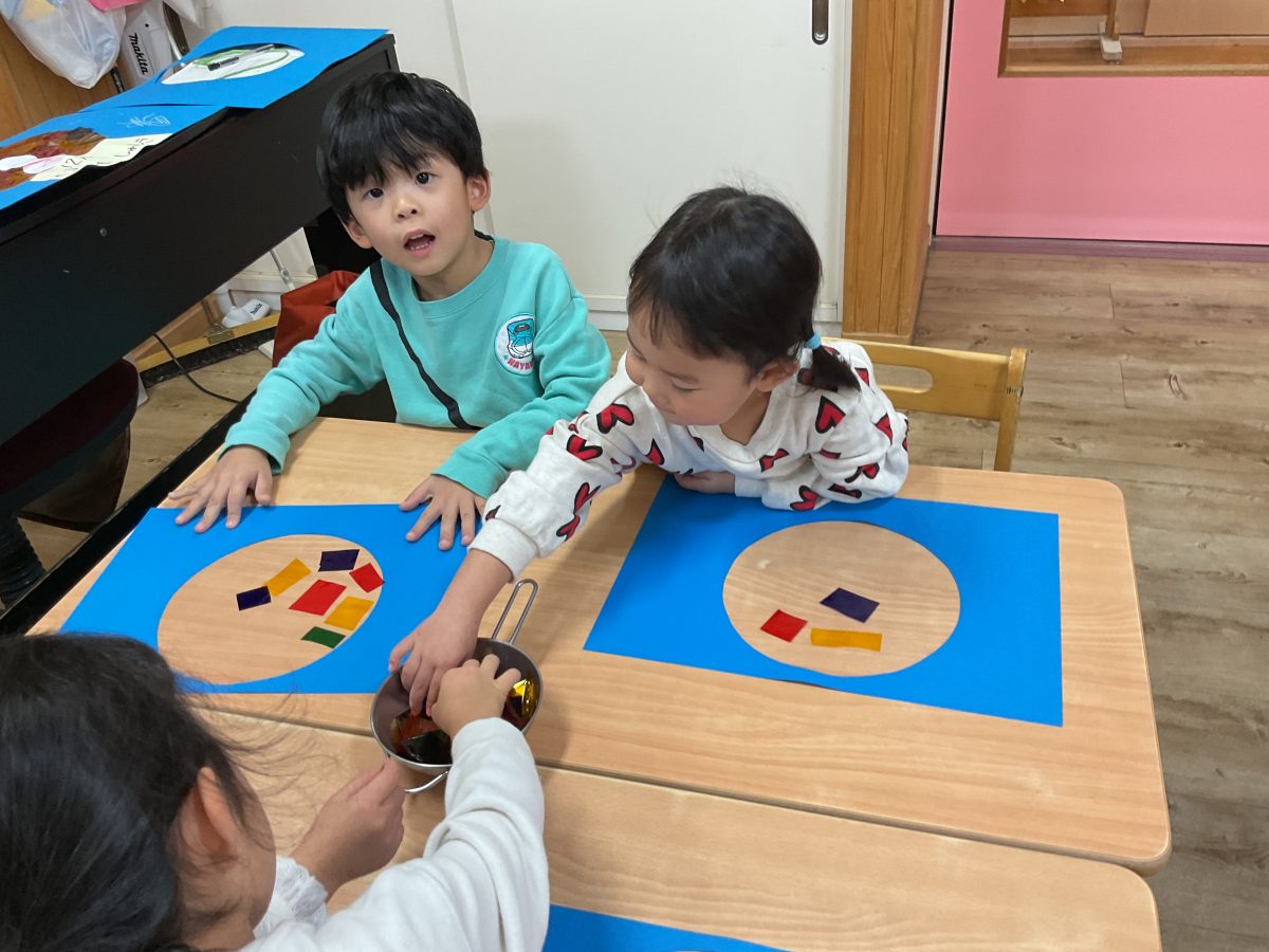 貼っていく中で色や形が違うものを発見するとお友だちに見せて共有してみたり、、、