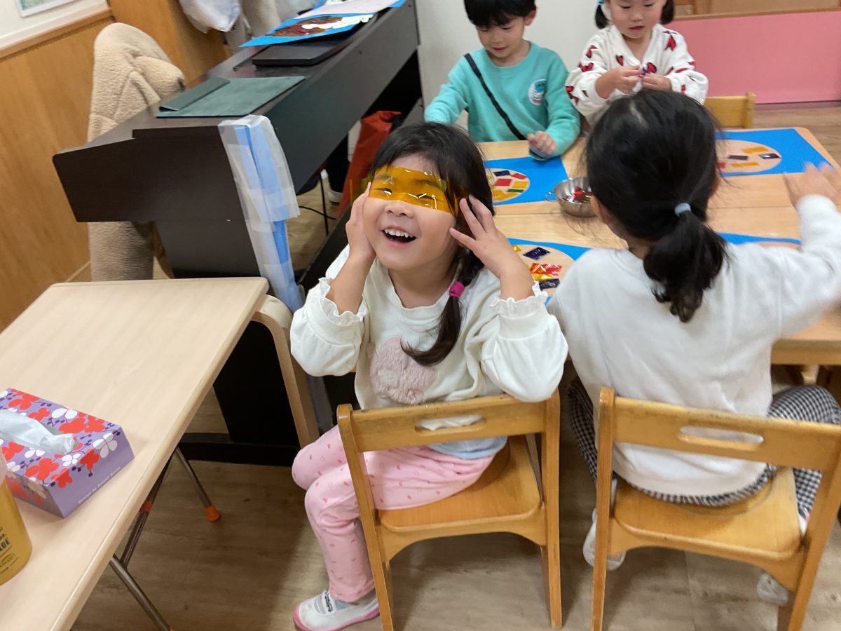 事前に穴を開けてテープを貼った画用紙に好きな色のカラーフィルムを貼っていき