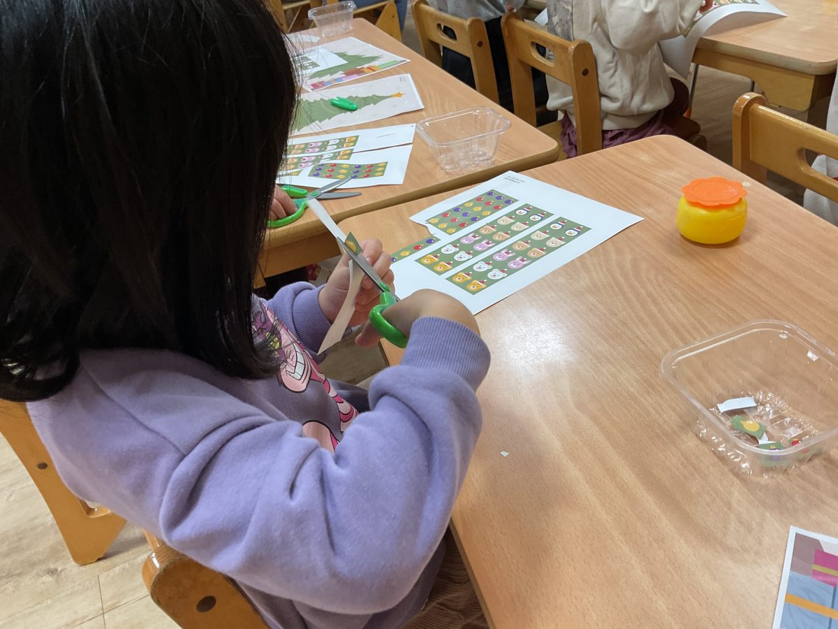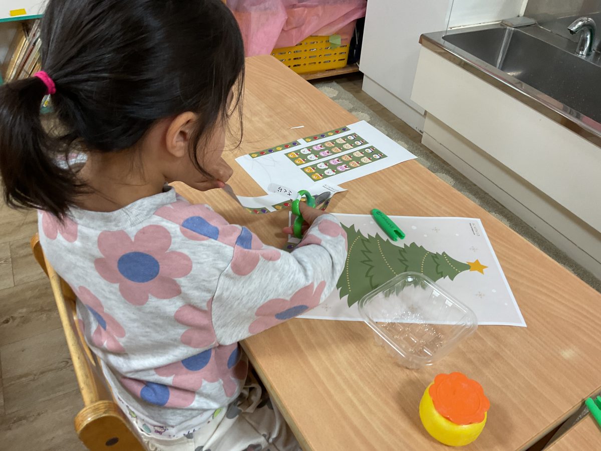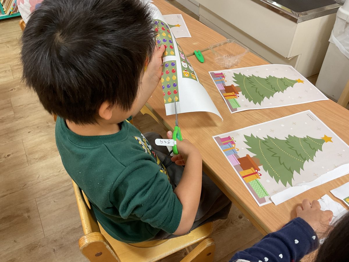 クリスマスツリーの装飾遊びをハサミを使いながら楽しみました!