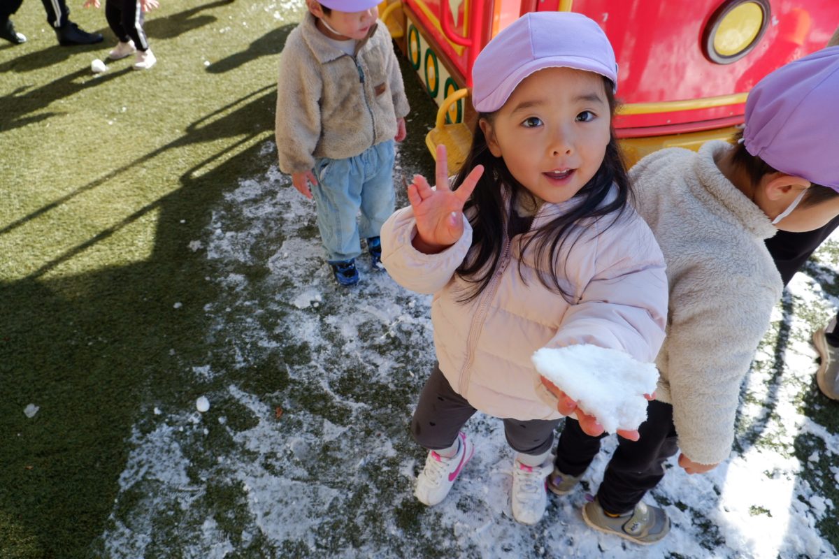 テラスに出たら一面真っ白の地面に大興奮のすみれ組!!